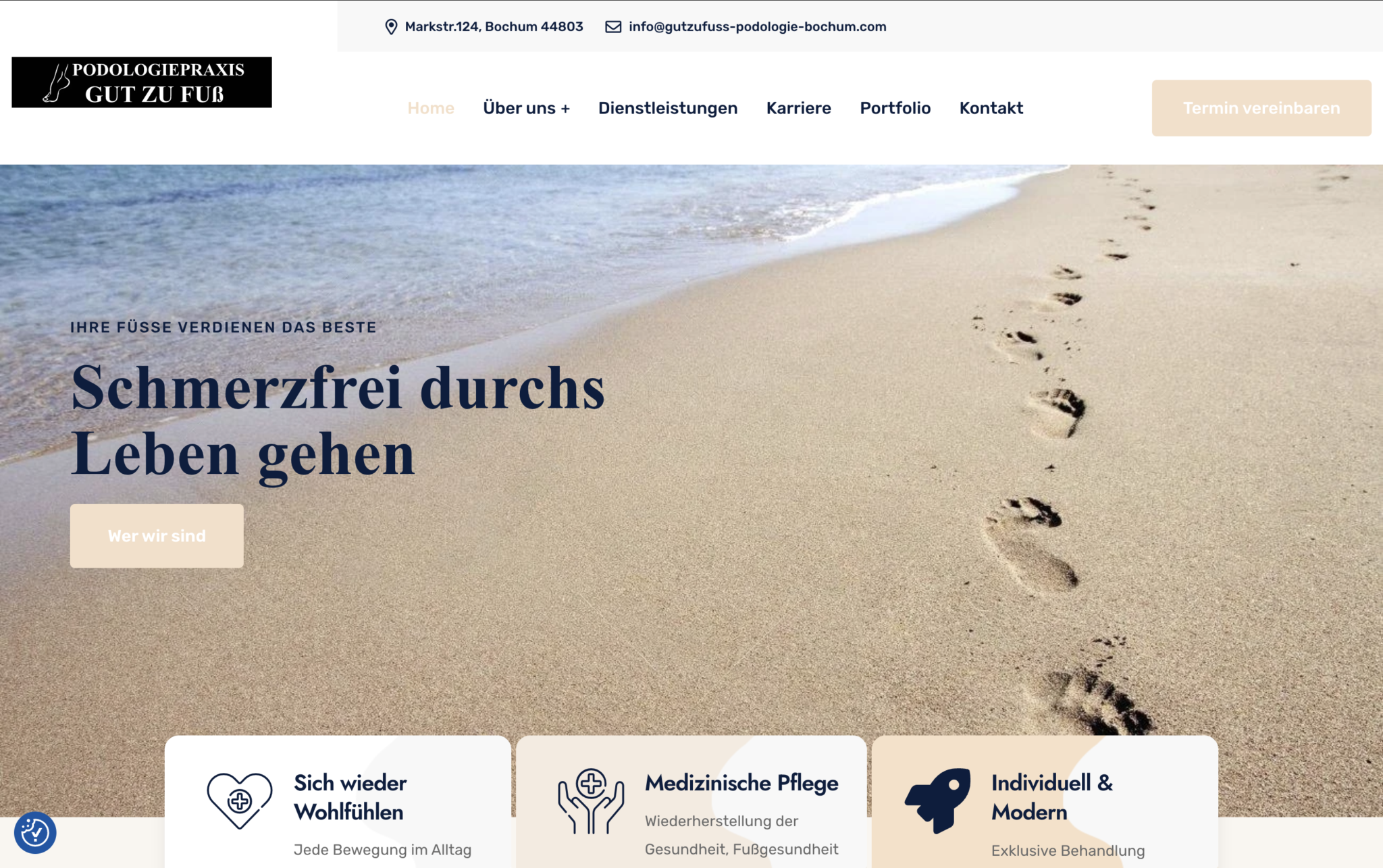 In Zusammenarbeit mit der Podologiepraxis Gut zu Fuß haben wir eine moderne und vertrauensvolle Website entwickelt, die die Neueröffnung der Praxis digital begleitet und die professionelle Außenwirkung gezielt stärkt. Die Zusammenarbeit entstand durch eine persönliche Weiterempfehlung. Bereits im ersten gemeinsamen Gespräch wurde deutlich, dass der Fokus vor allem auf lokaler Sichtbarkeit lag: Ziel war es, die neue Praxis online auffindbar zu machen und potenzielle Patienten direkt über Google zu erreichen.